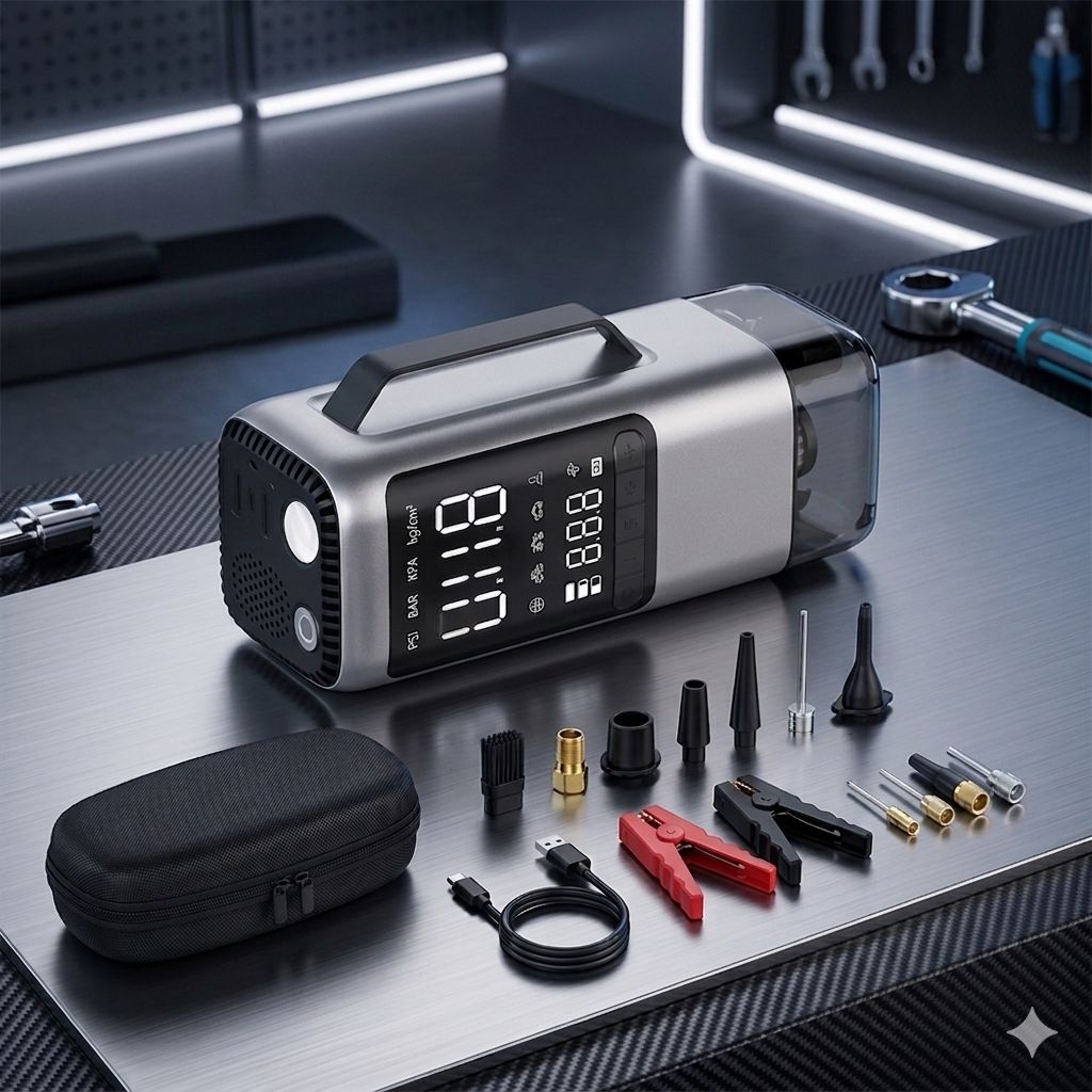 رفيقك المثالي على الطريق! جهاز واحد يغنيك عن عشرات الأدوات؛ ينفخ الإطارات بسرعة فائقة، يشغل بطارية السيارة الميتة في ثوانٍ، ويشحن جوالك في أي مكان. مزود بشاشة رقمية دقيقة وإضاءة طوارئ قوية.