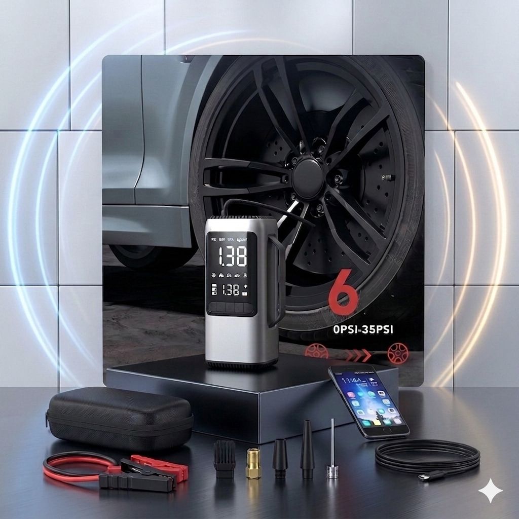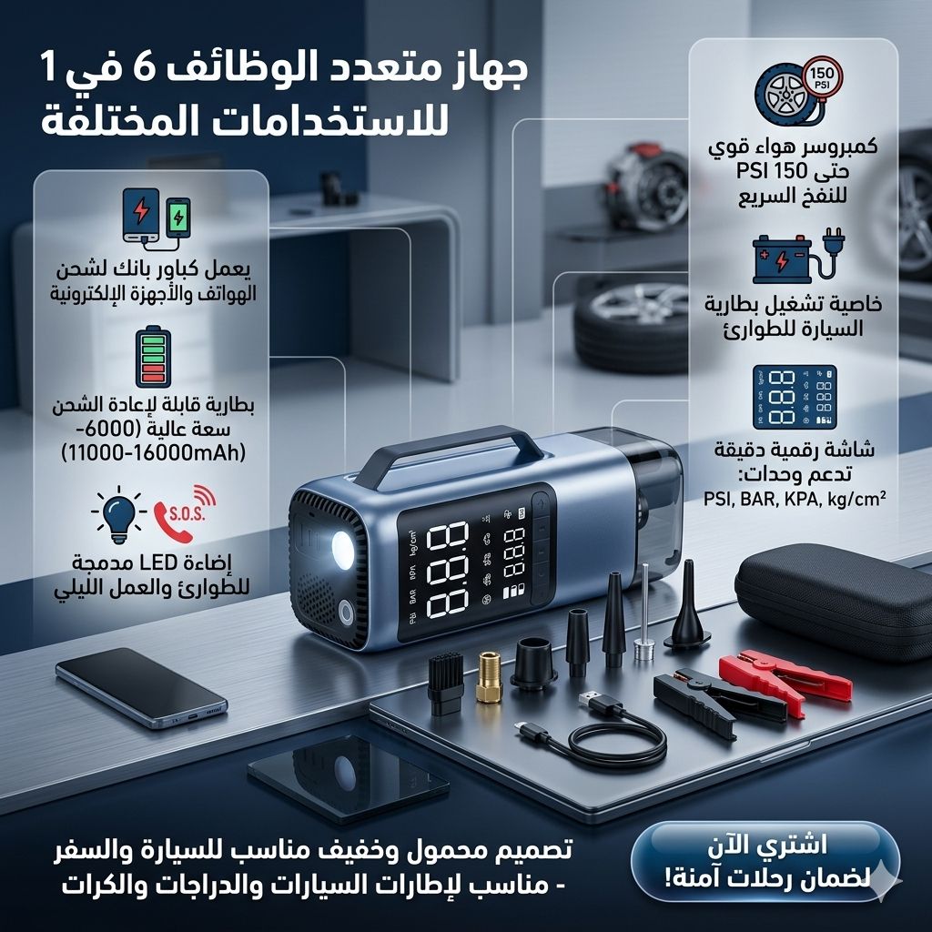 هل تخيلت يوماً أن تنقطع بك السبل بسبب بطارية فارغة أو إطار نائم في منتصف الليل؟ وداعاً للقلق من رحلات البر والسفر. نقدم لك الجهاز الأكثر مبيعاً والأكثر طلباً لكل صاحب سيارة، الحل الشامل الذي يجمع 6 وظائف أساسية في قبضة يدك.
