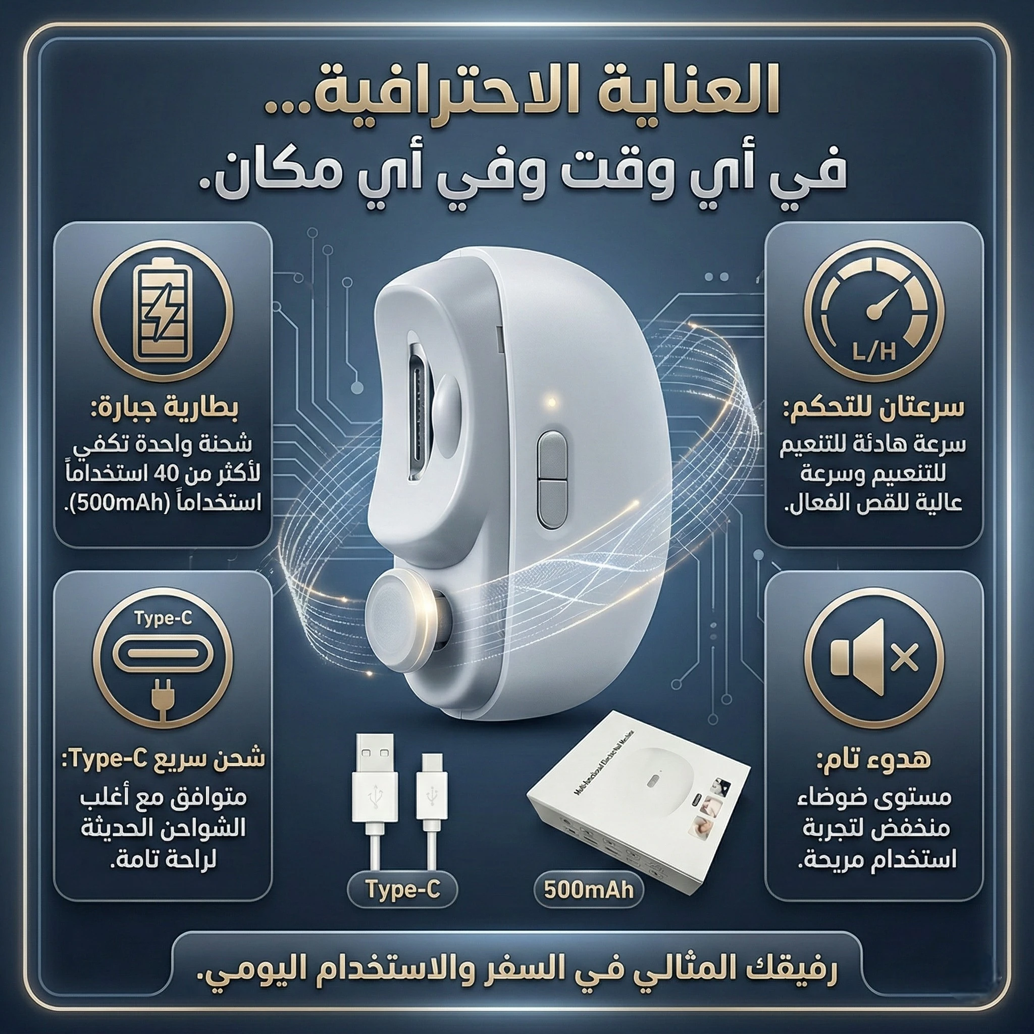 احصل على أظافر مرتبة وناعمة خلال ثوانٍ بدون أدوات تقليدية أو فوضى. الجهاز يجمع بين القص والتلميع بذكاء، ليمنحك نتيجة نظيفة واحترافية في المنزل.