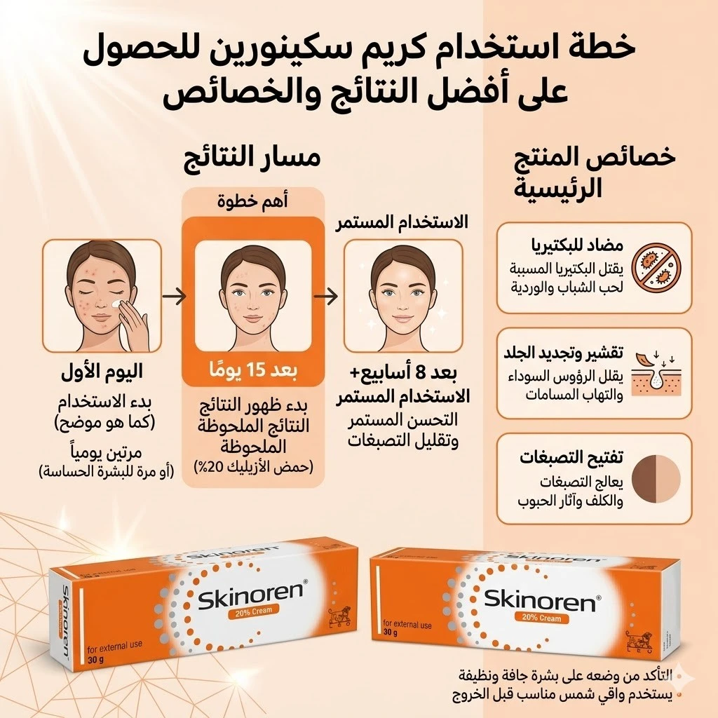 الحماية: يجب استخدام واقي شمس SPF 30+ خلال النهار طوال فترة العلاج لحماية بشرتك من التصبغ.